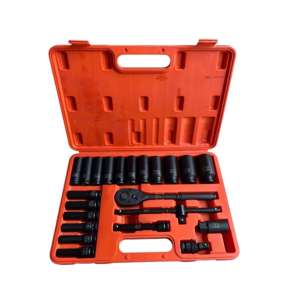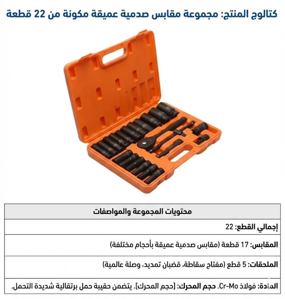 كل قطعة لها مكانها المخصص، مما يوفر عليك وقت البحث عن المقاس المناسب وسط العمل؛ حيث يضم البكج 22 قطعة تشمل الحبات العميقة، قضبان التمديد، المفصل العالمي، وهندل السقاطة، ليكون رفيقك الأول في الورشة أو في شنطة السيارة للطوارئ.
