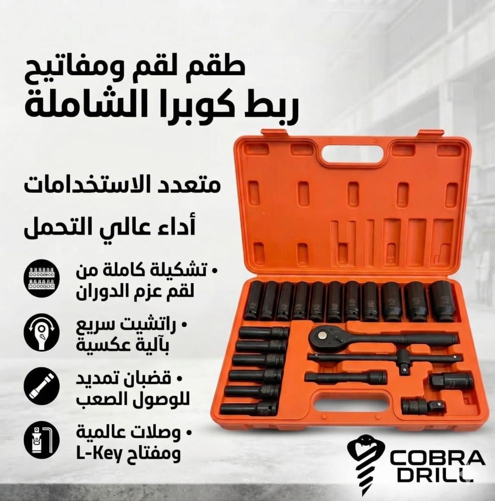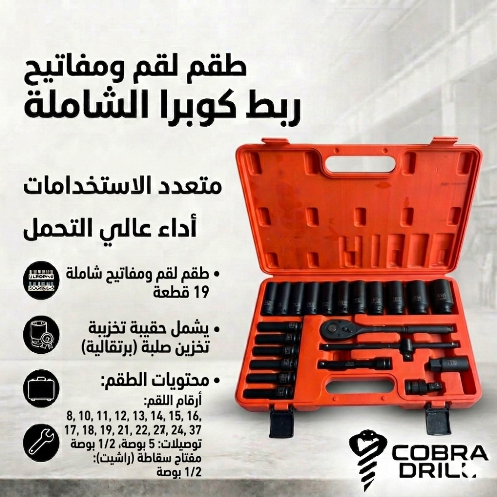 طقم كوبرادريل المطور (M-9) المكون من 22 قطعة هو ورشة عمل لاسلكية ويدوية متكاملة، صُمم خصيصاً ليمنحك السيطرة الكاملة على صيانة السيارات بفضل مزيجه الفريد بين الحبات العميقة وأدوات القيادة اليدوية الاحترافية.