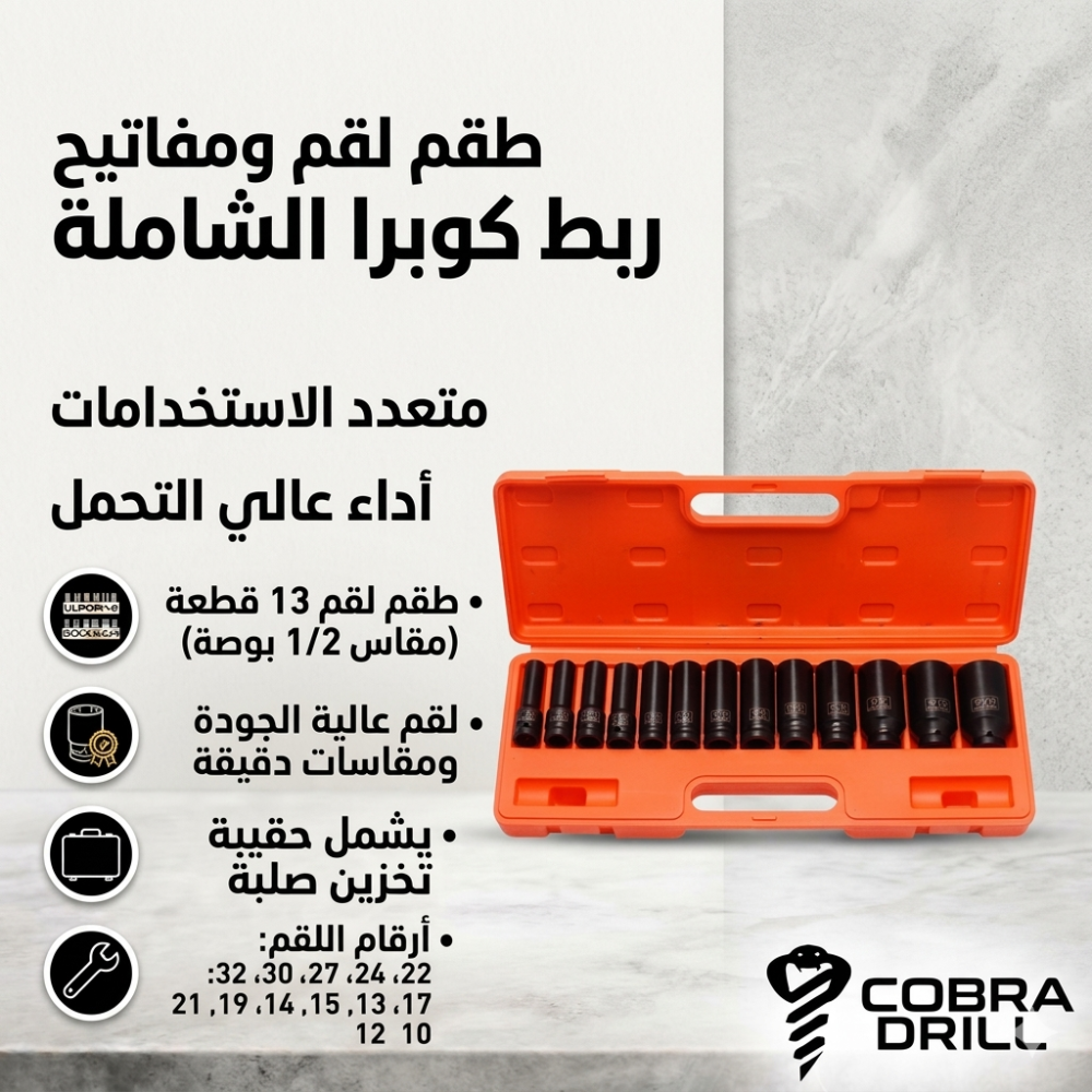 طقم حبات كوبرا دريل الطويلة (M-17) هو الحل الاحترافي للوصول إلى الصواميل الغائرة والبراغي الطويلة، حيث يوفر عمقاً إضافياً وقوة تحمل فائقة تجعل من صيانة سيارتك مهمة سهلة وسريعة.